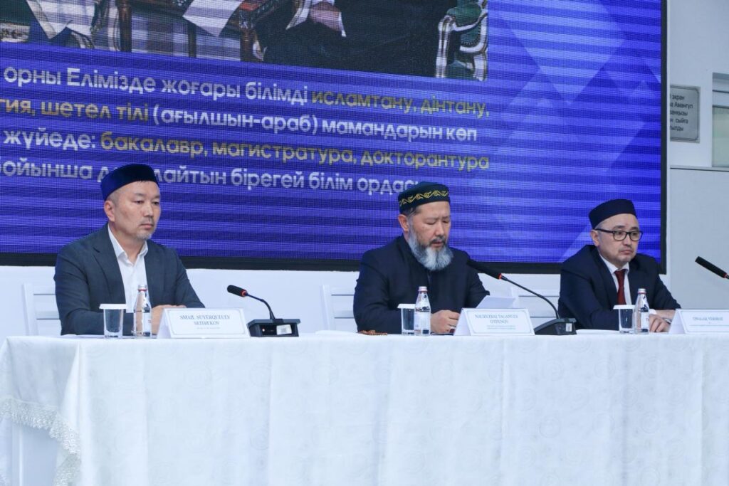 Бұл жиында модератор қызметін атқарған университет проректоры Ершат Ағыбайұлы Оңғар ұстаздар қауымымен арнайы жолыққан Бас мүфти Наурызбай қажы Тағанұлы хазірет пен оның кеңесшісі Смайыл Сүйерқұлұлы Сейтбековке алғысын жеткізді.